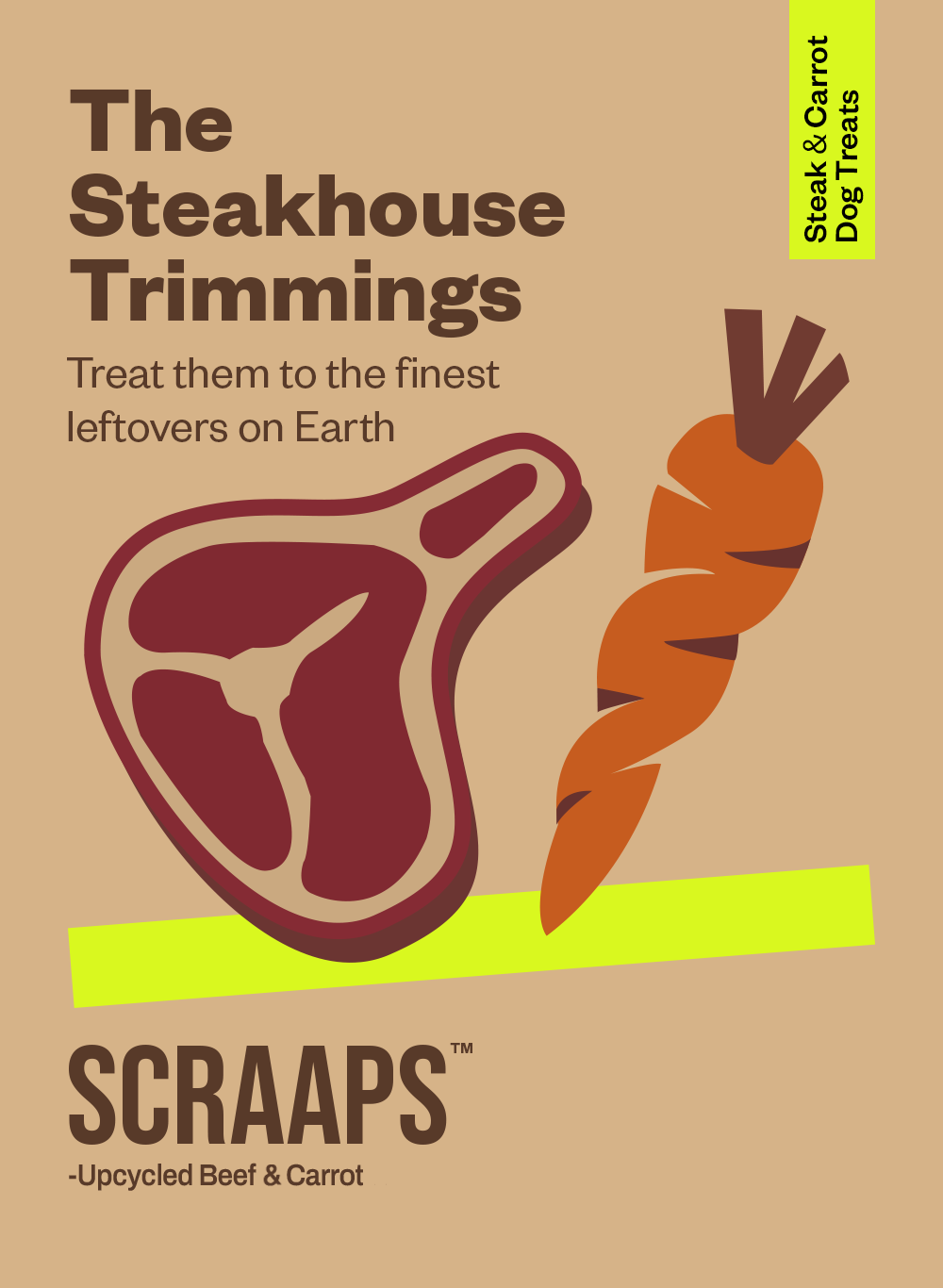 Scraaps is a concept dog treat brand that turns restaurant food scraps into upcycled treats. For this project, we designed the packaging and created a static three-piece social media campaign designed to make sustainability fun and modern.