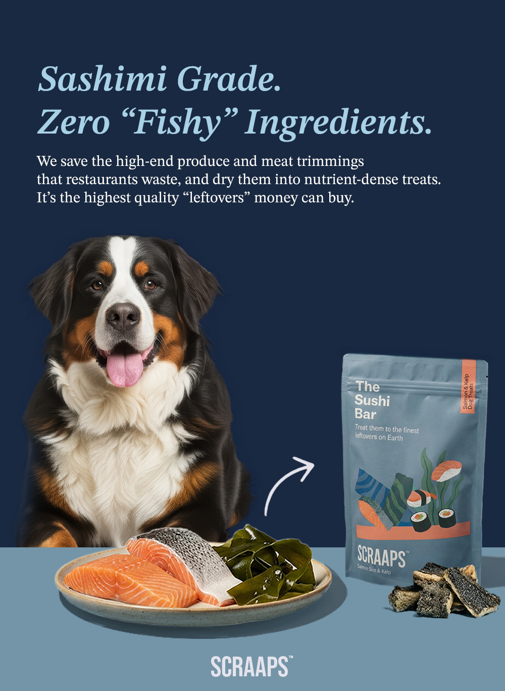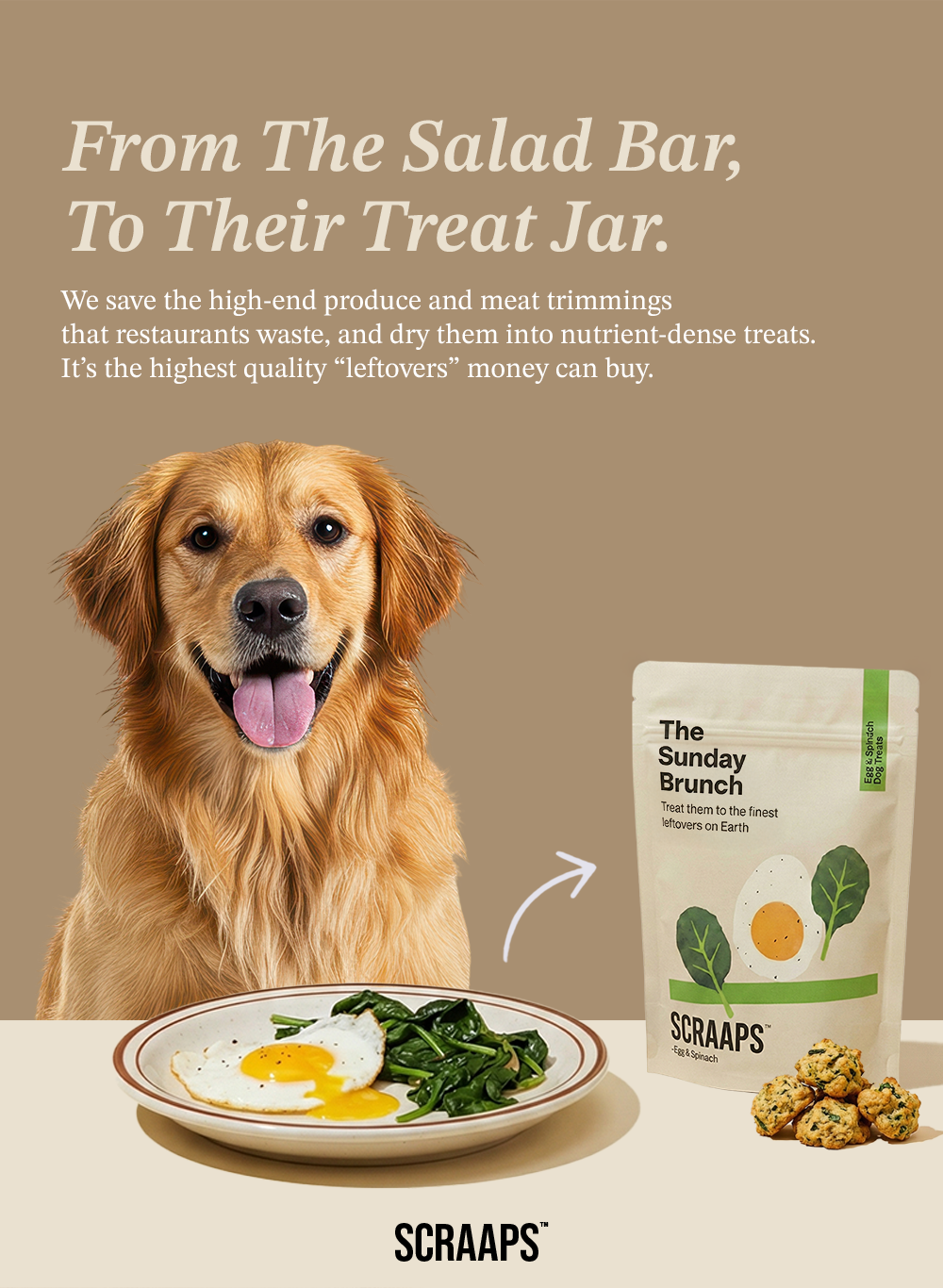 The campaign solves this issue by reframing food scraps as premium ingredients. Each ad pairs a dog with restaurant-level food like fish, steak, and fresh produce and connects it directly to the final Scraaps treat. The ads replace skepticism with familiarity of the food we eat, showing that these ingredients and are still good for dogs.